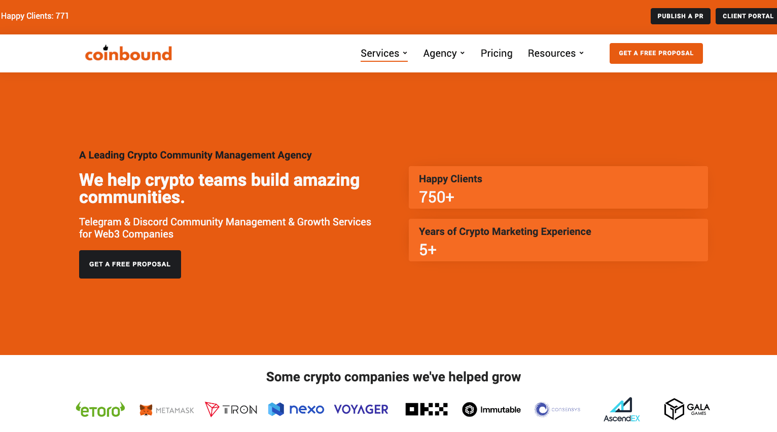 Coinbound is an exciting leading community management agency that specializes in managing and building communities for Web3 brands. They provide a diverse range of services, including content creation, community engagement, and analytics, to help brands create and maintain vibrant online communities.
