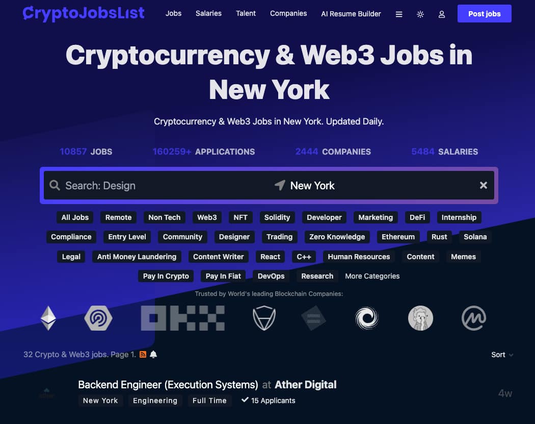 Kicking off our exploration of Web3 job boards is Cryptocurrency Jobs, a reputable platform that positions itself as a premier hub for blockchain and cryptocurrency roles. It’s backed by a network of esteemed companies like Polygon and AAVE, offering a diverse range of positions spanning technical and non-technical domains.