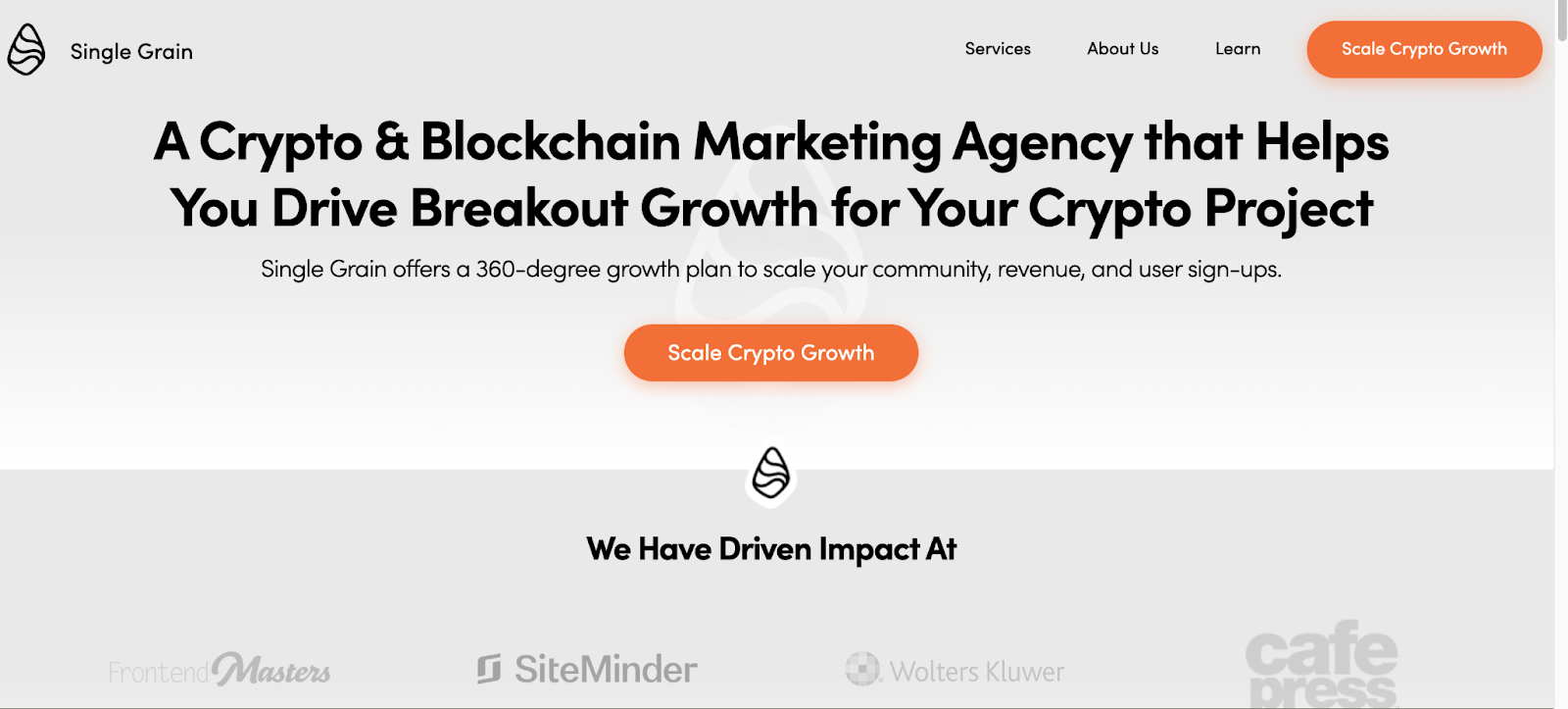 Single Grain is one of the reputed crypto & Blockchain advertising companies offering a 360-degree paid ads marketing plan. The agency is led by Eric Siu, known for helping companies like Amazon and Uber acquire customers.