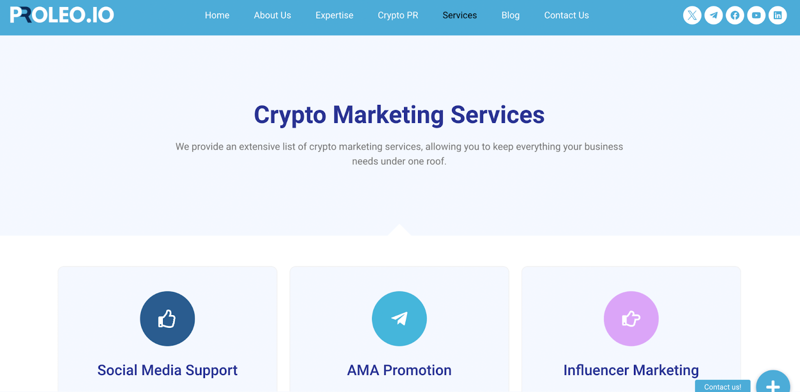 Proleo is your all-in-one solution for comprehensive crypto marketing services. With expertise in social media support, Proleo offers full promotion across platforms such as Twitter, Instagram, Facebook, YouTube, Reddit, and Medium.