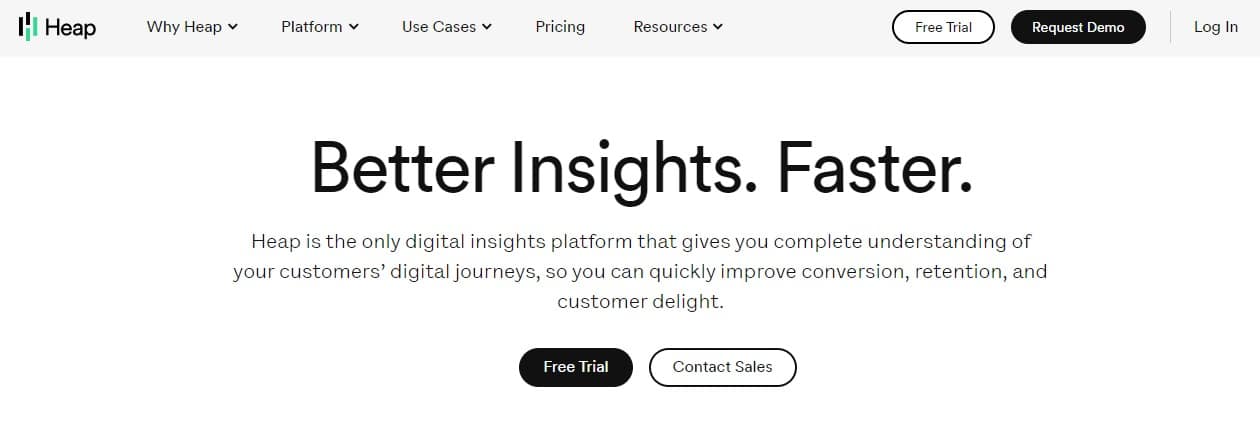 Heap is another powerful marketing analytics platform for Growth Marketers, offering an all-encompassing digital insights dashboard that captures and analyzes every user’s journey effortlessly. It automates data collection, eliminating the need for manual tagging and providing comprehensive datasets for maximum utilization.