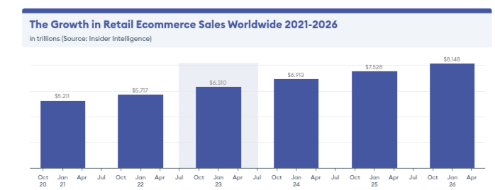 In 2024, it is predicted that there will be more than $6.9 trillion in e-commerce sales worldwide. Here is a pictorial depiction of year by year growth in retail ecommerce sales worldwide (2021-2026):