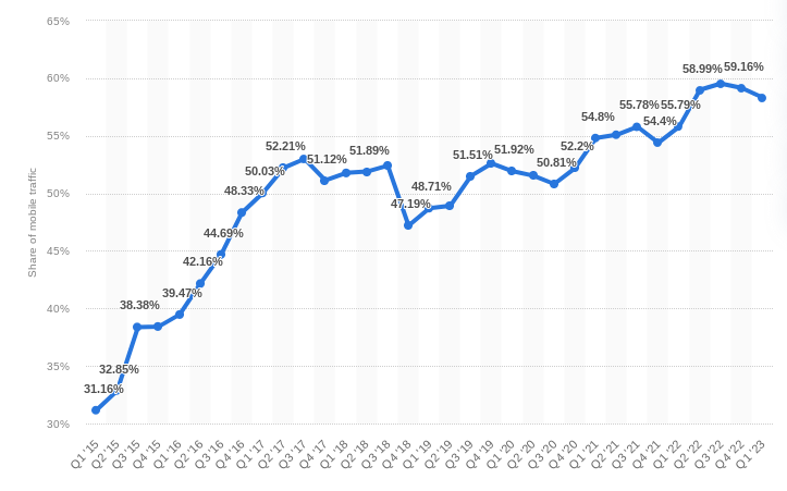 Every year, the use of mobile phones increases significantly, and people utilize them for numerous purposes. The most typical method is to use websites to find information. Here is a pictorial depiction of percentage of mobile device website traffic i.e. 59.16% in the first quarter of 2023: