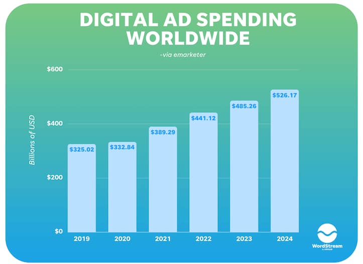 Online advertising is becoming increasingly important in the worldwide economic scene, as seen by the huge increase in digital ad spending from an estimated $485 billion in 2023 to a predicted $526 billion in 2024. Here is a pictorial depiction of year by year growth in digital ad spending: